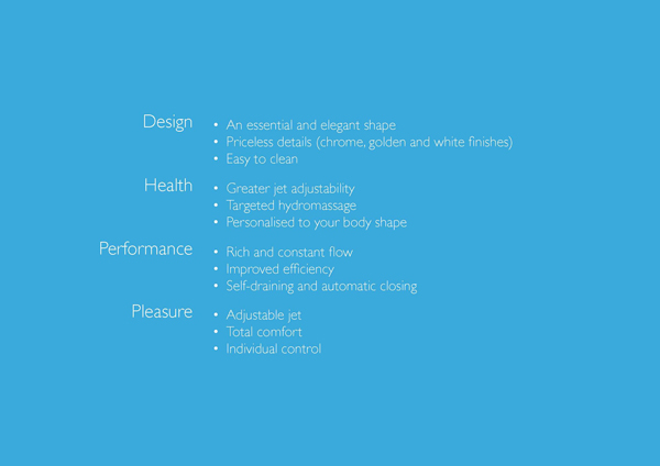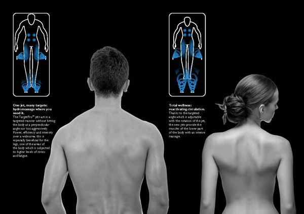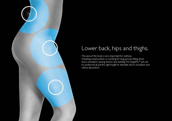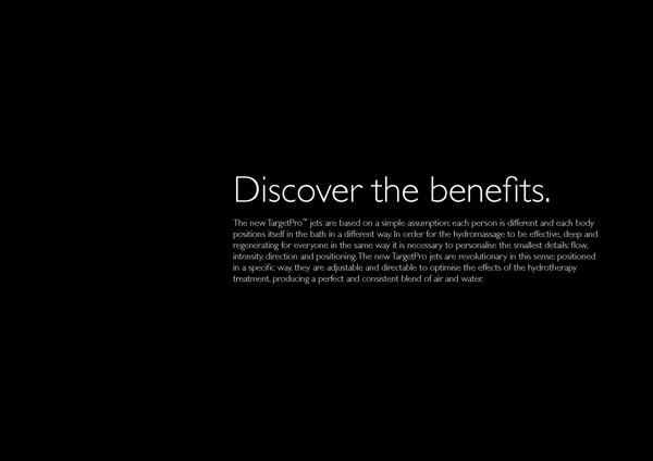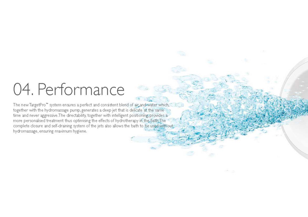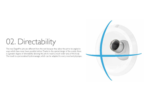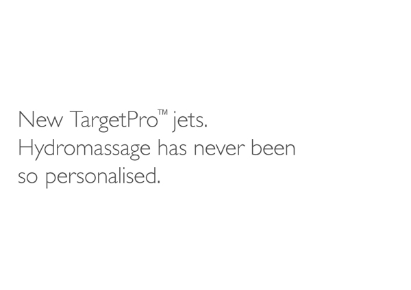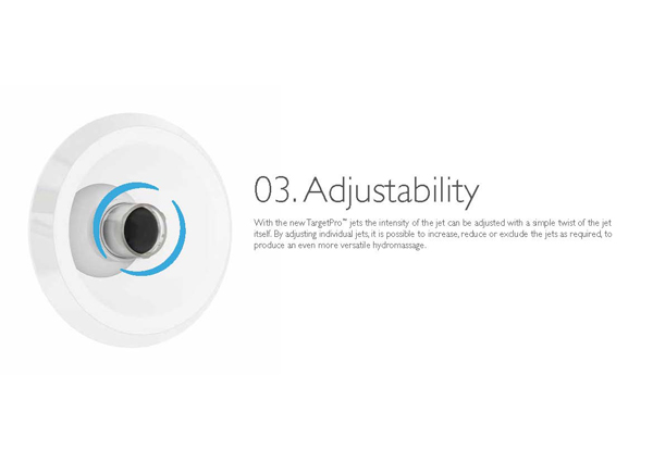 Az új TargetPro™ fúvókák azon egyszerű feltevésre alapoznak, hogy minden személy egyedi és minden test máshogy helyezkedik el a kádban. Ahhoz, hogy hidromasszázs mindenki számára ugyanolyan hatású, mély és regeneráló legyen, a legkisebb adatok testre szabására van szükség: áramlás, intenzitás, irány és pozícionálás. Az új TargetPro™ fúvókák e tekintetben forradalminak számítanak: különleges az elhelyezésük, szabályozhatók és irányíthatók a hidroterápiás kezelés hatásának optimalizálása érdekében, tökéletes és konzisztens levegő-víz keveréket állítanak elő.