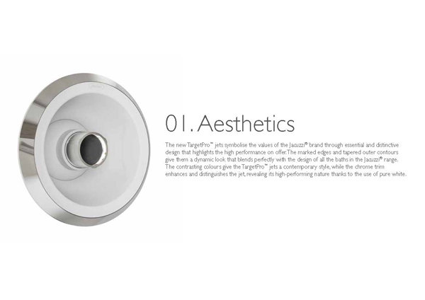 Az új TargetPro™ fúvókák a Jacuzzi márka értékeit szimbolizálják olyan meghatározó és alapvető dizájnnal, amely kiemeli a magas teljesítményt. A markáns élek és kúpos külső kontúrok olyan dinamikus megjelenést adnak, amely tökéletesen illik a Jacuzzi termékkínálatának összes kádjához.